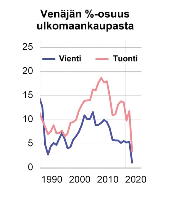Vuonna 2022 Venäjän aloittama sota Ukrainassa on romauttanut Venäjän-kaupan määrän käytännössä takaisin nollaan.